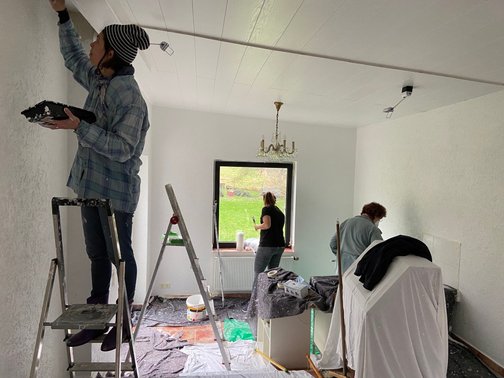 Um Kontakte haben wir uns im vergangenen Jahr auch stark bemüht. Zunächst zu unseren Nachbar:innen- am Priembergweg wohnen tolle Menschen und es ist schön in einer bunten und aufgeschlossenen Nachbarschaft zu leben. Dann sind wir Mitglied im Dachverband der Beginen geworden. Zudem sind wir im Netzwerk für Stadtwandel, aktive Gießkannenheldinnen und Mitglied der Ehrenamtsagentur Essen. Über die Ehrenamtsagentur haben wir einen Social Day vermittelt bekommen, an dem 13 starke Männer und Frauen unseren Carport renoviert und aufgeräumt haben, in dem wir seitdem das Café anbieten. Des Weiteren sind wir mit „Werden hilft“ vernetzt vor allem, um auf dem Laufenden zu sein, was jegliches Engagement im Bereich Flucht angeht. Natürlich haben wir nach wie vor enge Kontakte zu den Beginen in Rüttenscheid, die uns immer wieder unterstützen, sei es durch aktives Anpacken bei uns im Haus oder durch essen unserer Äpfel 😊. Und zum Schluss möchten wir noch den sehr herzlichen Kontakt zur Evangelischen Kirchengemeinde Kupferdreh nicht unerwähnt lassen. Wir sind Frau Pfarrerin Emge und Herrn Pfarrer Laser sehr dankbar, dass sie unsere Veranstaltungen regelmäßig in der Gemeinde kommunizieren. Wir freuen uns immer sehr über ihren Besuch und die sehr zugewandte Vernetzung. Morgen (16.11.) werden wir unser Hausprojekt im Gottesdienst zum Buß- und Bettag vorstellen und freuen uns sehr über alle die, die um 19 Uhr in die Evangelische Kirche an der Dixbäume kommen!