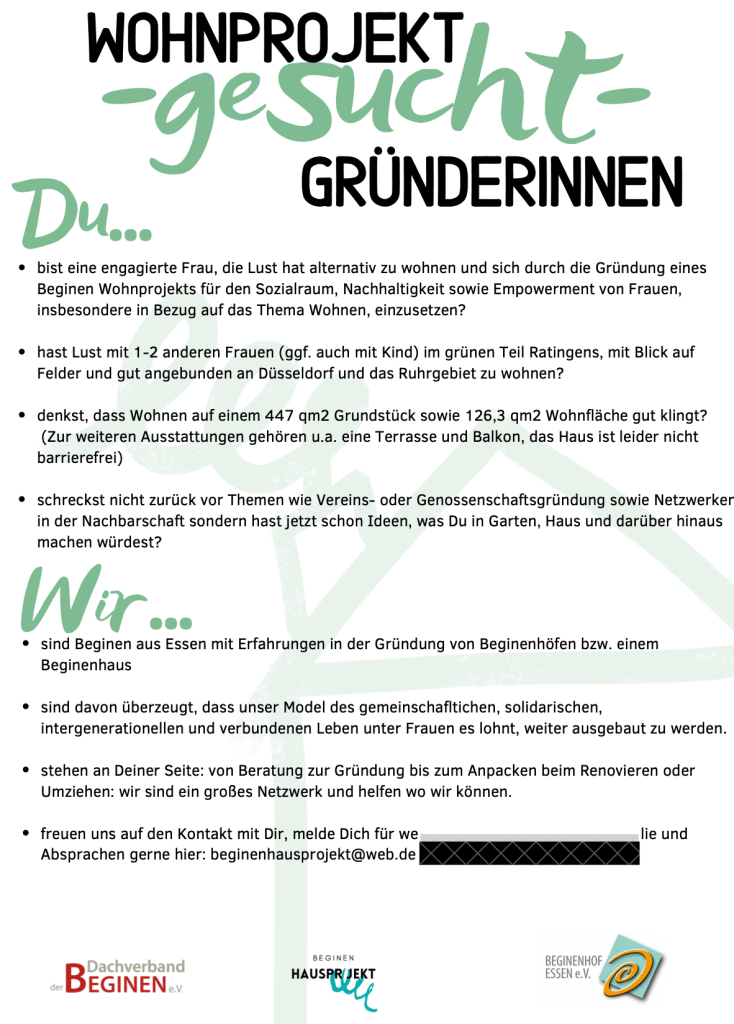 Eine weitere Person, ohne die es unser Projekt nicht geben würde, ist Waltraud Pohlen, Vorstand des Dachverbands der Beginen. Wir sind Waltraud nicht nur dafür dankbar, dass sie uns bisher bei jeder Frage geholfen hat und immer ein offenes Ohr für uns hat, sondern auch dafür, dass sie uns in einen wirklich spannenden Prozess mit hineingenommen hat: aktuell sind wir dabei einem weiteren Beginen-Haus Starthilfe zu geben. Für eine Immobilie suchen wir aktuell noch nach Frauen, die Lust haben ein Hausprojekt zu starten. Das Ganze ist im Ratinger Osten und ein wirklich toller Flecken Erde. Interesse? Dann nehmt gerne Kontakt zu uns auf!