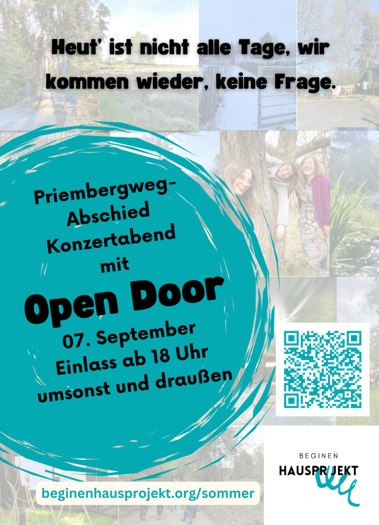 Und das alles tun wir zu den Klängen der Band „Open Door“ unseres Nachbarn Uli Plasberg, die mit Jazz und Weltmusik aufspielt. Wir würden uns freuen, möglichst viele begrüßen zu dürfen und vielleicht sogar das Tanzbein zu Dudelsack, Akkordeon, Trompete und Schlagzeug zu schwingen!