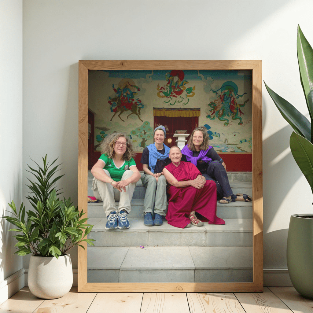 Hallo, wir sind Anna, Kathrin und Stéphanie. Im Jahr 2024 sind wir vor die große Herausforderung gestellt worden aus unserem Wohnprojekt ausziehen zu müssen. Seitdem wohnen wir in einer Senior:innenresidenz, reflektieren was uns wichtig ist (z.B. während eines Aufenthalts im Kloster Thösamling, wo du uns auf dem Bild links mit unserer Freundin Sangmo siehst) und träumen von einem neuen Ort für uns und unsere Ideen.